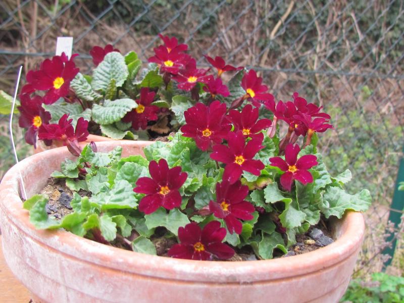 Vorne `Moerheimii´, die wegen ihrer kleinen Kronen und des ganz flachen Wuchses an die ursprüngliche Primula juliae erinnert, die Farbe ist freilich nicht dieselbe. Dahinter `Saladin´.
