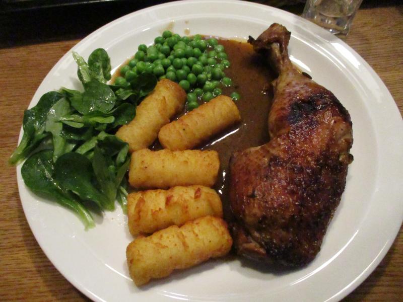 Heute gab es den Rest vom gestrigen Feiertagsessen - Grappahähnchenschenkel (mariniert mit Grappa und verschiedenen Obstsäften) mit Kroketten, Erbsen und Feldsalat ganz frisch aus dem Garten.