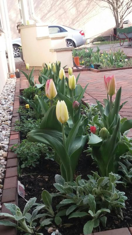 Das hier könnte T. kaufmanniana 'Scarlet Baby' (?) sein. Wenn sie aber noch blasser werden, kommen auch andere Sorten wie 'Shakespeare' in Frage. (Für 'Showwinner' ist sie wohl nicht leuchtend genug.) Die Pflanzen stehen dort schon lange.