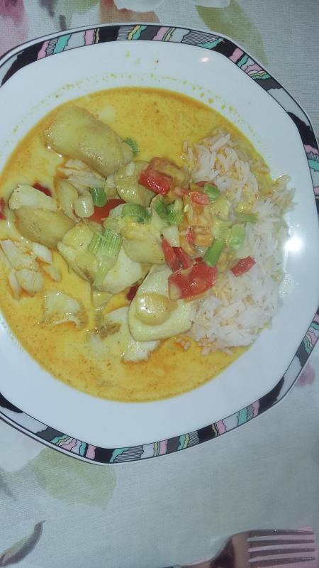 Und heute Kabeljau-Currypfanne mit Paprika und Frühlingszwiebeln, dazu Basmatireis