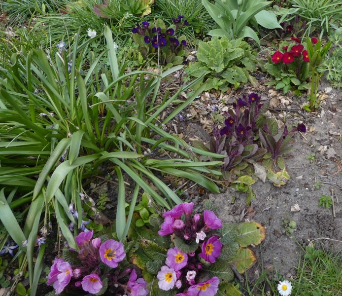 So eine Ecke, in der Sämlinge, Ableger und sogar Unkraut wachsen dürfen, habe ich hier auch. Es gefällt ihnen, wenn man sie in Ruhe lässt. Nach und nach öffnen die Primeln nach dem langen Winter jetzt ihre Blüten. Die Pflänzchen mit dem dunklen Laub gefallen mir am besten. 'Drumcliff' war vor fast 10 Jahren die erste Sorte davon hier im Garten. Leider gab es auch heute wieder kurze Hagelschauer, aber die schöne Farbe der Blüten ist nicht zu übersehen.