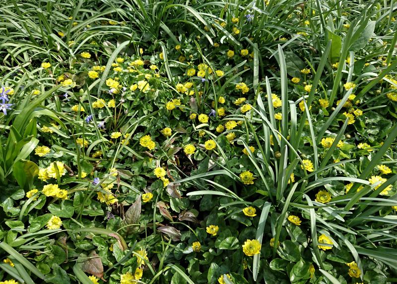Mein erstes Scharbockskraut, das nicht Ficaria verna ssp verna war, stammte als Wildfund aus England. Es hatte sich viele Jahre lang sehr moderat bestockt - Sämlinge traten erst auf, als ich weitere Klone in den Garten pflanzte. Inzwischen ist es eine bunte Mischung geworden, von der auch in der Wiese zahlreiche Vertreter auftauchen.