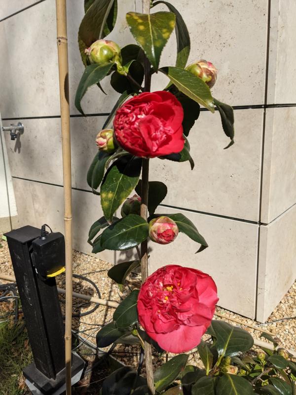 Kamelien tun sich hier etwas schwer: im Sommer oft zu trocken und zu heiß, Boden zu lehmig und eher verdichtet, aber die hier gedeiht im Schatten des Hauses an der Nordseite sehr gut: 'Black Lace'