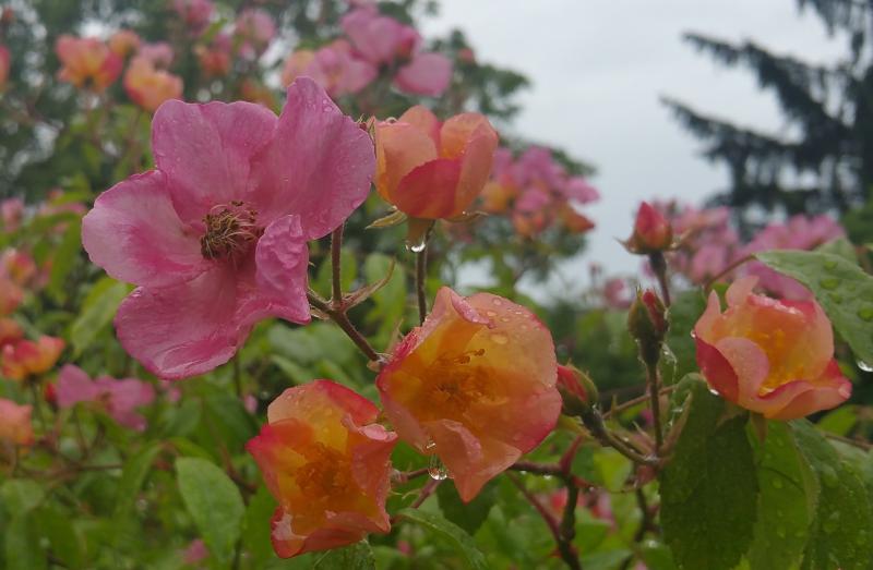 Die habe ich bei meinem ehemaligen Haus an den Zaun gepflanzt. Sie blüht dreifarbig - die jungen Blüten erst Gelb/Orange, später Lachs und dann Rosa. Gerade am Morgen ist die Farbvielfalt am Größten.