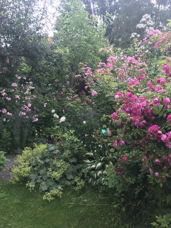 Ich möchte an dieser Stelle noch einmal dringend vor der Louis Lens Rose mit dem lieblichen Namen 'Musquee Sans Sousis'warnen,die für mich alles andere als sorglos war.Im Sommer hatte ich über deren mühevolle Entfernung bereits ausführlich berichtet.Ich bin wahrlich die Letzte,die eine Rose aus dem garten verbannt,zumal ich ja reichlich Platz habe,aber das ging dann doch über meine Kräfte und auch der optische Eindruck an Masse ,im Vergleich zur Anzahl der Blüten,war eher verschwindend gering.Klar blümelt sie stetig vor sich hin,wenn man regelmäßig die sich schnell entwickelnden ,netten Minihagebuttenstände ausschneidet.Trotzdem kein großartiger Eindruck.Ich hatte sogar schon mal den Verdacht gehegt,dass da irgendein Wildsämling gedankenlos selektiert wurde und schnell in die Vermarktung gegangen ist.Nach 10 Jahren ein 4x4m Stachelmonster,das alles in seiner Umgebung plattmacht und Wege unbegehbar.Kein Spaß daran und darin herumzuschneiden.Als sie dann noch anfing armdicke Ausläufer zu treiben,war es für mich entgültig vorbei.Eine Rose für die offene und weitläufige Wildlandschaft,würde ich mal urteilen.