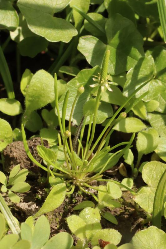 Gestern habe ich beim Jäten eine winzige Blütenpflanze entdeckt, die bislang noch nie in meinem Garten aufgetaucht war: das kleine Mauseschwänzchen, Myosurus minimus, ist etwa 5 cm hoch.
