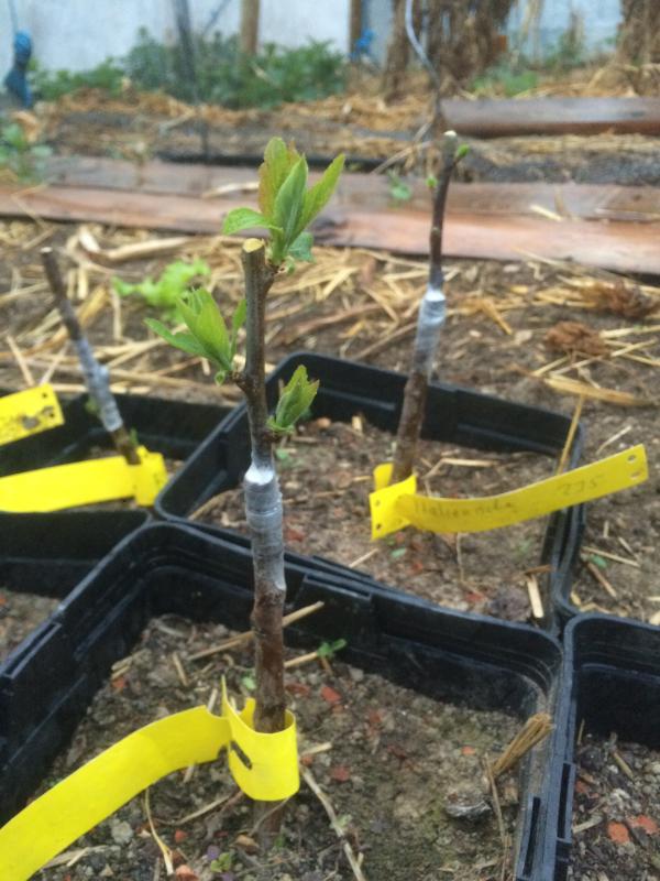 Äpfel gehen weit besser als Sommerveredelung. Hier eine Veredelung von älterem Holz, gemacht wieder mitten im Sommer. Drei Veredelungen gemacht, davon treiben zwei dieses Frühjahr aus. Unbekannte Sorte, aus Pietätsgründen veredelt.