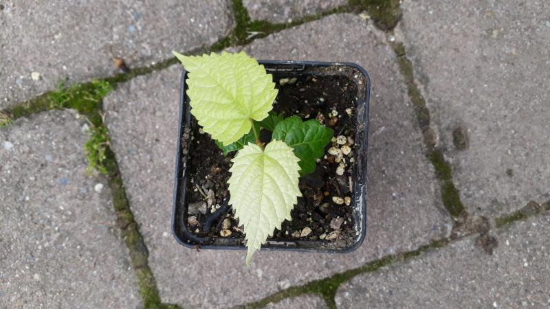 Die kleine Linde wurde von der Paprika getrennt, steht in einem kleinen Töpfchen und sieht definitiv anders aus. Waren die drei Keimblätter und die beiden Folgeblätter noch sattgrün und sehr untypisch in ihrer Form, sind die beiden "richtigen" Blätter golden/gelbgrün.