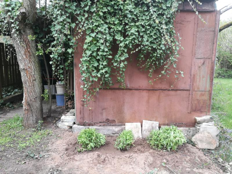 Heute habe ich es komplett aus dem Beet raus genommen. Künftig wird es an einer besonderen Stelle seine Fähigkeiten und sein Durchhaltevermögen beweisen können. Es steht nun da wo die letzten 70 Jahre ein kleiner Holzschuppen stand. Der Boden war hart wie Beton. Ich habe ihm drei Löcher gebuddelt und es einfach reingestopft. Zwei Kannen Wasser hat es auch bekommen, bin ja kein Unmensch.