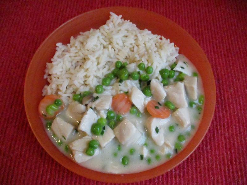 Reis mit Hühnerfrikassee + zusätzliche Erbsen und Schnittlauch