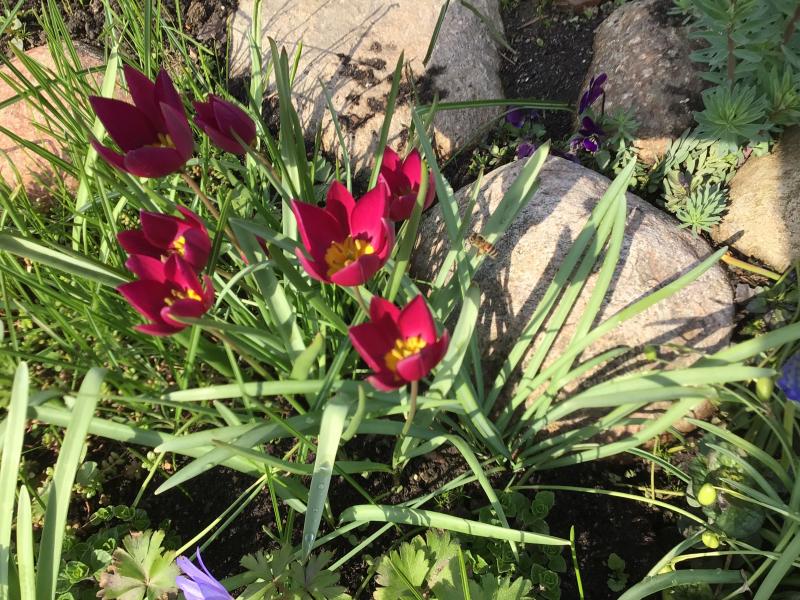 Tulipa kaufmannia Stresa blüht seit Ende März. Die roten Außenseiten fallen nur bei geschlossenen Blüten auf.