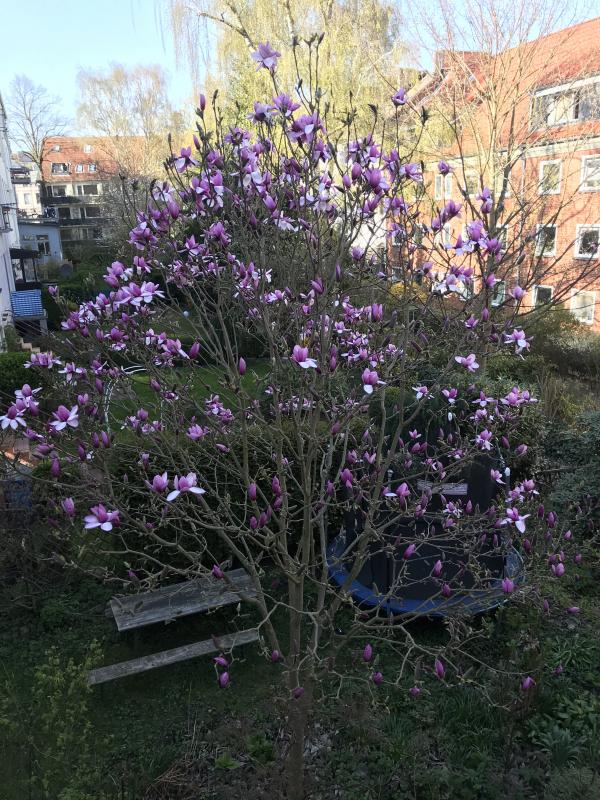 Die großen soulangianas haben es bei nervigem Leichtfrost gerade so geschafft, manche Blüten etwas "crunchy"...