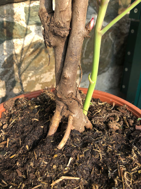 Ich mache mal ein paar Bilder von der Pflanze. Für mich sehen die Blätter, die aus der Erde im Topf kommen, wie vom Edelreis aus. Dann wäre auch vermutlich die Stelle, die über der Erde ragt, nicht die Veredelung. Ich hoffe, dass hier jemand etwas genaueres weiß.