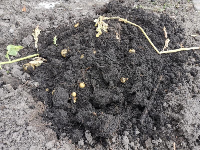 Zwischenzeitlich verkümmert der sichtbare Pflanzenanteil immer mehr (s. Bild). Ich denke, daß ich im Laufe der Woche zur Ernte schreite, bevor die neuen Kartoffeln beginnen, neu auszutreiben.