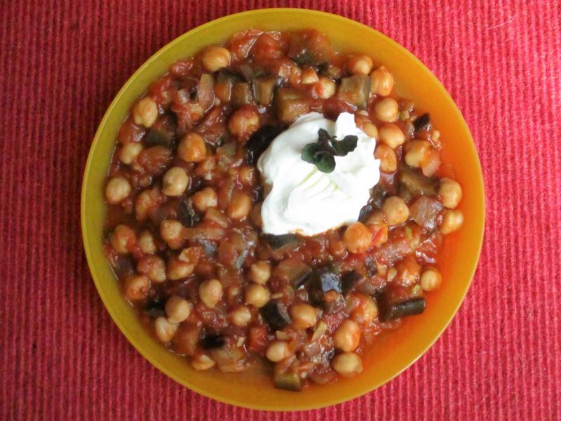 Maghmour (Aubergine, Zwiebel, Kichererbsen, stückige Tomaten, Knoblauch, frische Minze, Öl, Salz, Pfeffer). Damit es nicht unnötig vegan wird, gab es einen Klecks Schmand dazu.