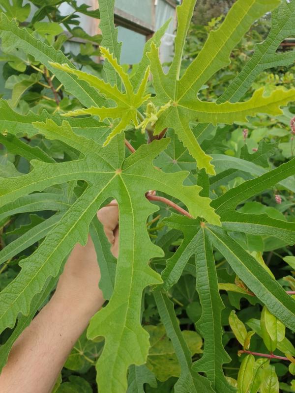 Meine beiden Ficus johannis var. digitata haben deutlich schmalere Blätter in Relation zu der Breite der Zwischenräume. Ich denke, das ist schon eher eine F. carica. RdB wäre grundsätzlich möglich, aber ohne Früchte ist das natürlich nicht seriös zu beantworten.