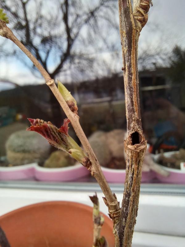 Vor ein paar Tagen fand ich an meiner 'Ave Maria', der Johannisbeere, die am diesjährigen Holz fruchtet, eine gammelige, tote Knospe. Beim abbrechen konnte ich dann dieses Loch sehen, woraus mich eine Raupe des Johannisbeer-Glasflüglers anguckte. Jetzt starb der Trieb noch nicht ab und ich entschied mich schmerzlicherweise die Raupe mit Holzwurmtod zu vergiften.