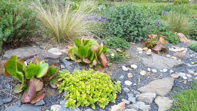 Die Bilder vom Steppenbeet finde ich besonders interessant, da sieht man sehr gut, wie Du das angelegt hast. Mir gefallen diese hier und da eingestreuten geschotterten Bereiche mit den großen Steinen dazwischen ausnehmend gut, das ist ein herrlicher Aspekt für die Zeit, wo die Stauden nicht alles überdecken. Und dann der großzügige Plattenweg, von dem man auch mal vernünftig aus arbeiten kann, ohne ständig die Balance auf viel zu kleinen Trittplatten verliert. Ich hätte vermutlich noch ein paar mehr Frühblüher eingestreut, vielleicht kleine, trockenheitsverträgliche Narzissen, Wildtulpen und dergleichen, auch die Muscari könnte man vielleicht mehr verteilen. Aber gerade auch mit den adretten grünen Blattschöpfen sind das im Moment sehr edel aus. Wirklich inspirierend, so in etwa kann ich mir das auch für meinen Vorgarten vorstellen! *geistige Notizen mach* :)