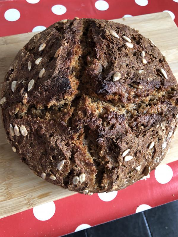 Ich bin gerade sowas von begeistert, weil mein allererstes Sauerteigbrot ganz ohne Hefe gelungen ist! Es ist fast genauso aufgegangen wie die mit Hefezusatz. Es ist ein fast reines Dinkel-Vollkornbrot, das ich aus Dinkelsauerteig, Dinkelvollkorn, den getrockneten Krümeln von zwei übrig gebliebenen Scheiben gekauftem Dinkelbrot und ein paar Sonnenblumenkernen gebacken habe, gewürzt mit Salz, Rübensirup und bayerischem Brotgewürz. Es schmeckt sehr gut (natürlich hätte ich wieder bis morgen warten sollen mit dem Anschnitt, aber so geduldig war ich heute nicht).