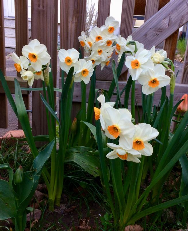 Die Spiegeleier-Party verliert auch am Abend nicht an Leuchtkraft - die Tazettennarzisse ’Geranium’ hat sich endlich entfaltet. Hier bei uns ist es noch ziemlich kühl, aber zum Ausgleich ist die Zwiebelblüte von beeindruckend langer Dauer.