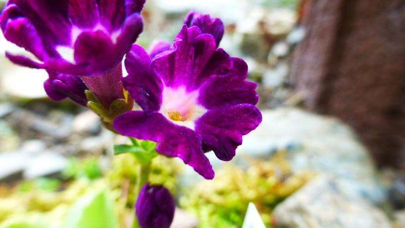 Eine Naturhybride zwischen Primula hirsuta und P. auricula (boothman's variety) mit purpurroten Blüten und weißem Augen von bis zu 10 cm hoch Sie blüht von April bis Mai und einer Breite von 15 cm. Bevorzugt gut durchlässigen Boden in voller Sonne. Bei uns steht sie auf kalkfreien Boden und eigentlich im steinigen Umfeld.