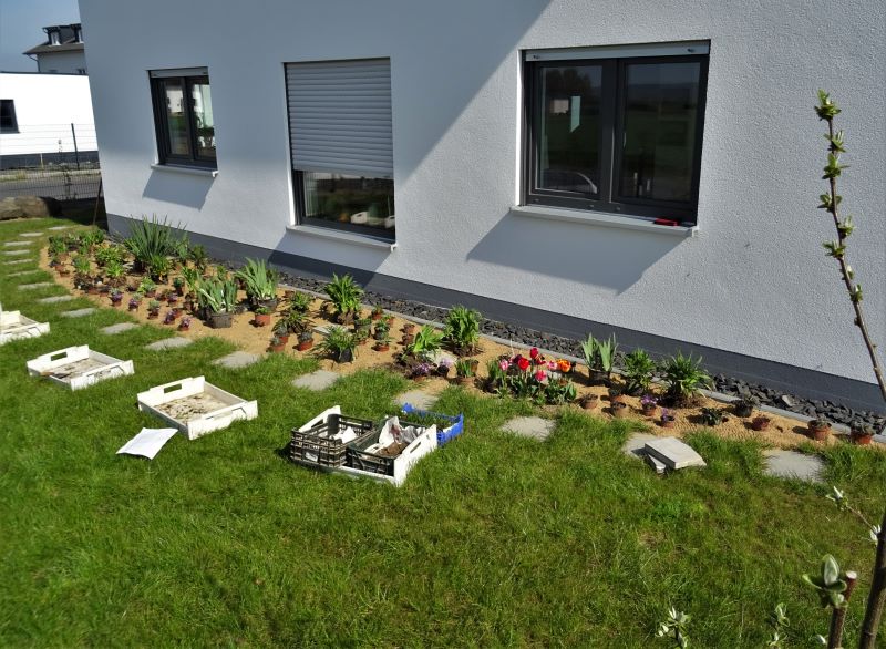 Ich bin ja kein Gestalter, höchstens mal im Umfang von 1/2 qm am Stück, weshalb ich doch angenehm überrascht war, dass sich die eingepackten Pflanzen mit vernünftigen Abständen auf das Beet verteilen ließen und nichts übrigblieb.