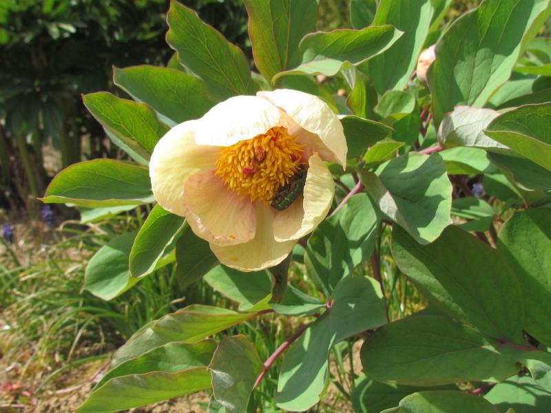Die mehr oder weniger gelben Mlokosewitschii fangen allmählich an, diese sitzt seit zwanzig Jahren, wurde im Lauf der Zeit riesig, dann vom Schlangenknöterich bedrängt, jetzt hat sie Luft und wird hoffentlich wieder groß. War mal meine Allererste, den Rosastich hat sie immer, damals war ich deswegen enttäuscht, heutzutage gefällt mir das ebenso wie die Reinfarbigen.