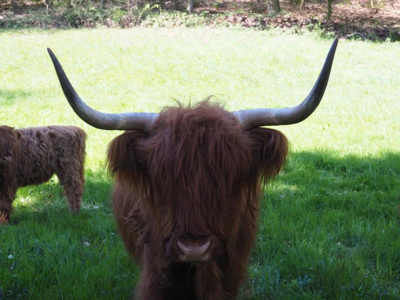 unterwegs musste ich halten. Ein Kälbchen. Direkt oberhalb vom Wiesengarten vor dem Waldrand steht Schottisches Hochland.