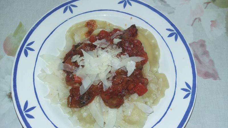 Gestern mit grünem Spargel und Ricottacreme gefüllte Ravioli mit mediterranenr Gemüsesauce und Parmesan (von der Pasta-Dealerin auf dem Markt ;)).