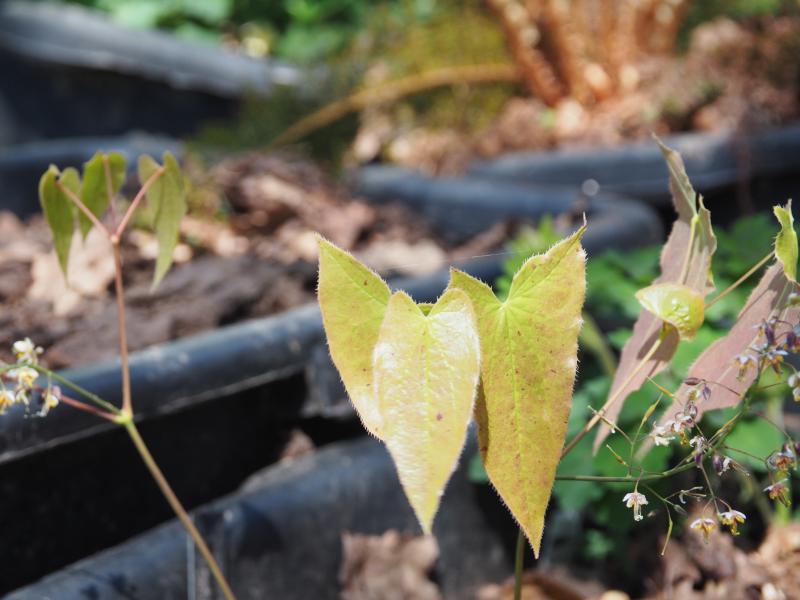 Bei Epimedien ist der Laubaustrieb ganz toll gefärbt. Im Verlaufe der Zeit werden die Blätter aber grün. E. grandiflorum verlieren die Blätter im Winter, andere E. sind wintergrün, manche färben ihre Blätter im Winter rot. Das hat auch seinen Reiz.