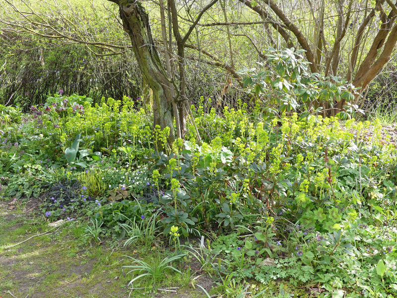 Euphorbia amygdaloides var. robbiae wächst hier üppig weiter durch's Schattenbeet. Dieses Jahr muss ich sie wohl doch mal etwas einbremsen, bevor sie anderes überwächst.