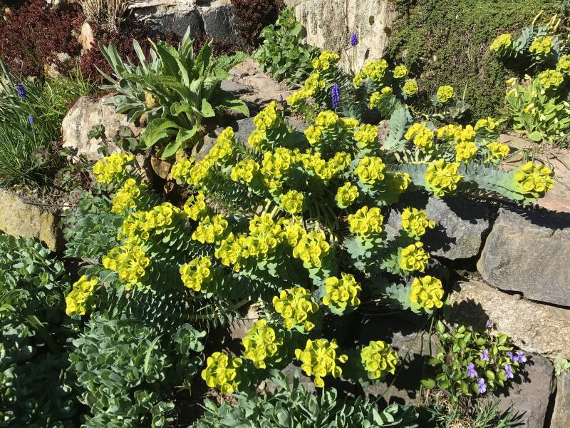 In meinem Steingarten ist jetzt die Walzenwolfsmilch in Vollblüte. Zugegen eine etwas triviale Pflanze. Aber in der Anwendung von Felsen oder Mauern hängend in der Blüte zu dieser Jahreszeit unübertroffen. Darüberhinaus lockt sie eine Vielzahl von Insekten an. Von Käfern, Fliegen, Wespen und Bienen ist alles vertreten. Ich sitze manchmal eine Viertelstunde davor und schaue dem Treiben zu. Leider ist meine Artenkenntnis sehr begrenzt ich staune immer nur, was es so alles gibt.