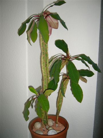 Luna, die haben wir auch!Verprengt die kugeligen Samen kreuz und quer, so daß in allen Blumentöpfen im Umkreis auch welche aufgehen. Aber: keine Ahnung, was das ist. Wir nennen es einfach "Exot". Dürfte ein Wolfsmilchgewächs sein...vielleicht sogar aus der Gattung Euphorbia...ich googel mal ein bißchen...