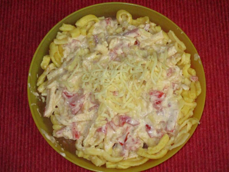 Hier gab es Spätzle mit Tomaten-Sahnesoße und Käse.