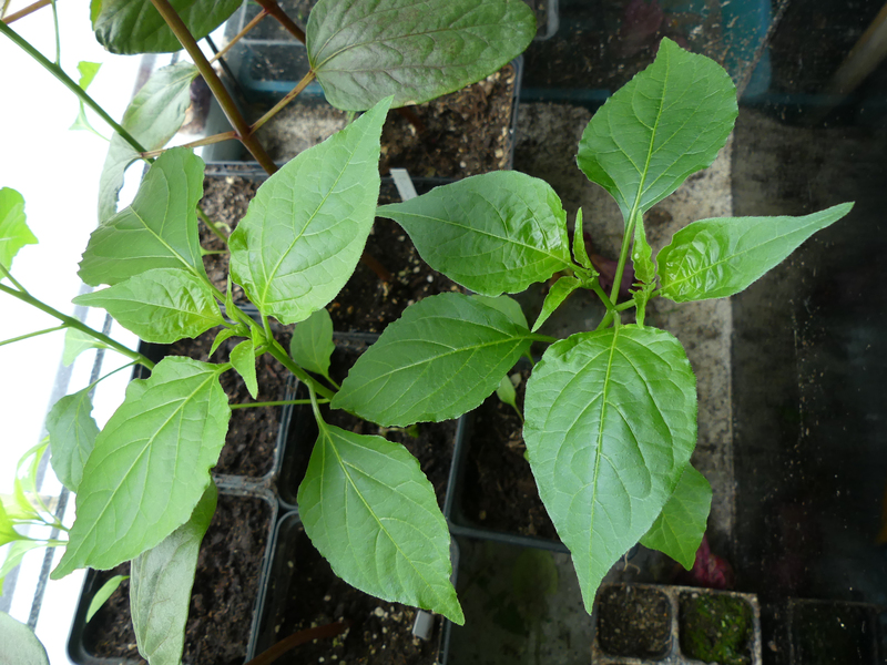 Hmm... das ganze ist etwas seltsam. Ich hatte 'Fish Pepper' ausgesät und das Töpfchen später mit ins Anzucht-Terrarium gestellt. Darin ging von 8 Körnern genau ein Sämling auf. Kurz darauf keimten diese hier in den umstehenden Aussaattöpfen in dem Terrarium. Ich konnte es mir nicht erklären, aber sie sahen zunächst wie Chili-Sämlinge aus.