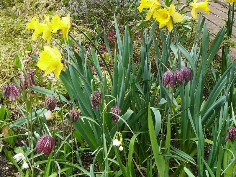 Ich hab mal schnell zwischen den Schauern fotografiert, mir gefällt es so gut, wie Dicentra, Vergissmeinnicht, Bärlauch, Corydalis und Günsel sich miteinander verwoben haben. Überhaupt ist jetzt Vergissmeinnicht-Zeit und ich finde diese blauen Wölkchen toll, dazu noch ein paar Tulpen und die Forellenlilien mit den Muscari.