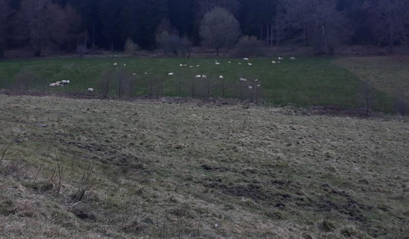 Hier also die Schnucken. Vorgstern standen sie noch im Bildvordergrund. Gestern morgen rechts. Seit gestern Abend links. ich möchte lieber nicht darüber nachdenken, ob ich da abends schon wieder stehe und zäune ::) Aber wenigstens liegen die Netze schon da. :-\