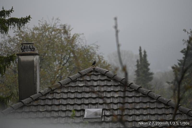 Unbeeindruckt vom stundenlangen Dauernieselregen sitzt dieses Amselmännchen auf Nachbars Dach und singt: . . (Aufgenommen mit 200 mm Brennweite aus etwa 20 m Entfernung, Ausschnittvergrößerung)