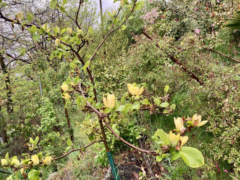 Wenigstens die gelben Magnolien ('Sun Spire') bringen noch ein paar Farbtupfer und nicht bloß dezentes Frostbraun in den "Regengarten":