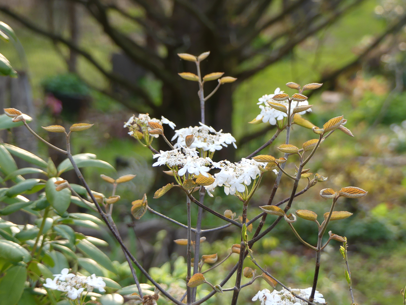 Viburnum furcatum 'Pink Parasol' blüht schon länger, die Blüten sind daher schon etwas ausgeblichen. Das gleicht der hübsche Austrieb nun wieder aus.