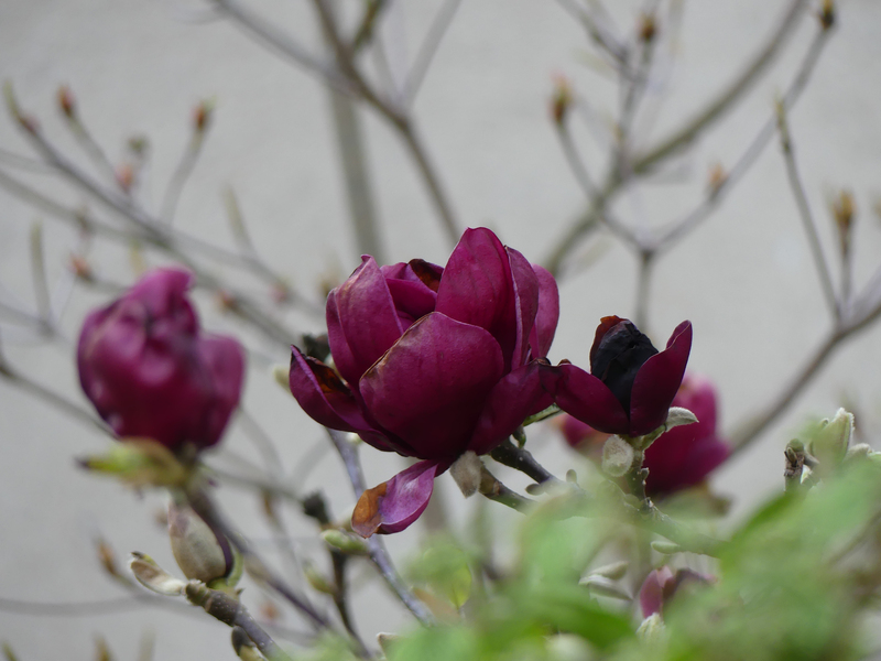 Ja, die eigentliche Blütemasse ist braun und in der Dämmerung nicht zu erkennen. 'Lennei' (im Vordergrund) ist ohnehin immer später dran und eine andere x soulangeana und 'Heaven Scent' an anderer Stelle scheinen sich noch passabel präsentieren zu wollen - wenn nicht doch noch Frost einen Strich durch die Rechnung macht.