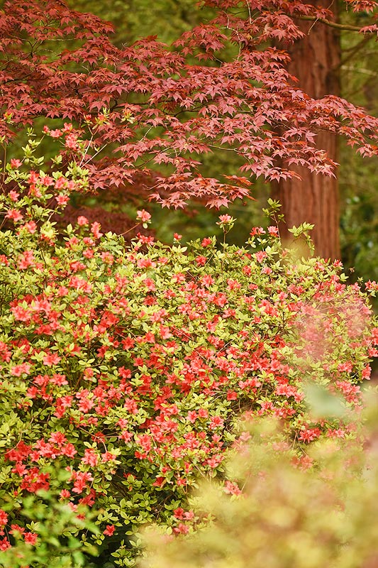 ... der "rote Hohlweg" mit strahlender Azalee unter dem Fächerahorn ...
