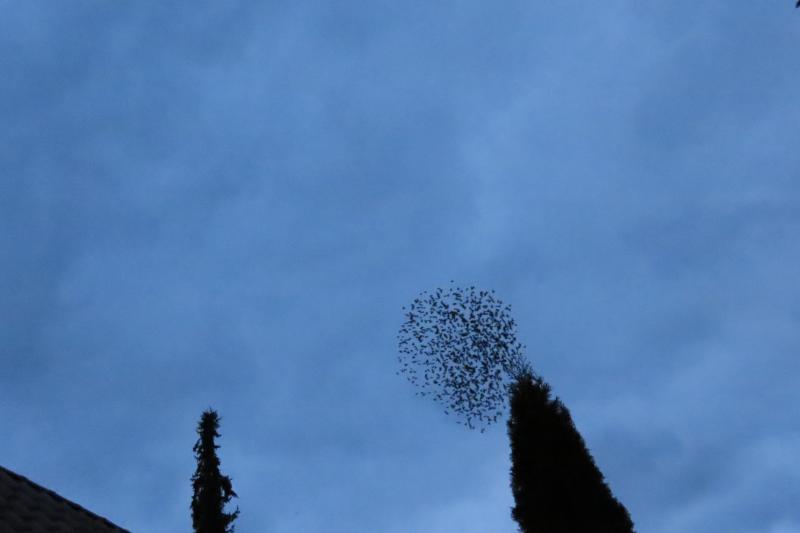 Wir haben das Glück, dass unser Nachbar entlang seiner Grundstücksgrenzen hohe Bambushecken (Rhizomsperre vorhanden ;)) gepflanzt hat. Zu unserer Seite sind das etwa 20 m. Für Stare ist das ein ideales Nachtquartier. Seit Mitte Januar können wir jeden Abend ein imposante Schauspiel beobachten. Ca. 500 bis 5000 Stare der Umgebung sammeln sich in den hohen Bäumen unseres Ortes, um sich dann nach und nach in den Bambusbestand zu begeben um dann nach ausgiebigen Geschnatter endlich zur Ruhe zu kommen. Besonders imposant sind natürlich die typischen und akrobatischen Formationsflüge, doch scheint sich im Zuge der fortschreitenden Jahreszeiten der Ablauf dieses Schauspielschule immer wieder zu ändern. Die Gruppe wuchs auf derzeit etwa 5000 Individuen an. Ich denke zur Zeit sind das wohl die Junggesell*innen der ganzen Region. Davor gabs eine Phase der Paarbildung. Da konnte man den ganzen Abend nur Zweier- oder Dreiergruppen beobachten, die ziemlich chaotisch umherjagten.