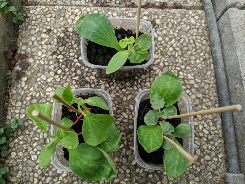 Keine Ahnung ab wann man mit Sicherheit sagen kann, dass die Veredelung geklappt hat, aber bis jetzt sieht es gut aus. Speziell die Wassermelonen sind wunderbar kräftig und haben fast alle schon ein neues Blatt dazu bekommen.