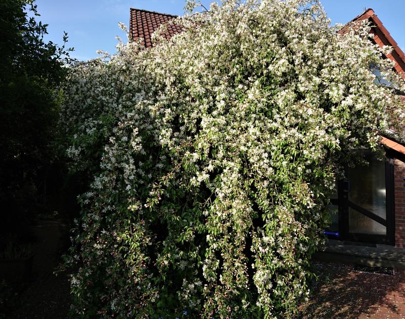 Der Briefträger muss den Hauseingang schon suchen! Der Hängeapfel blüht überreich (Wieso "Trauer"-apfel?)
