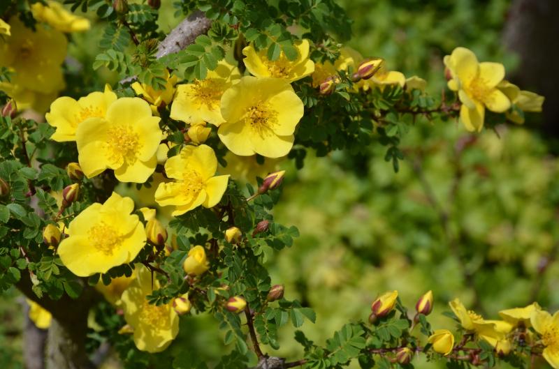 Erste Rosenblüten: R. pimpinellifolia 'Helen Knight', lauter kleine Sonnen! :D