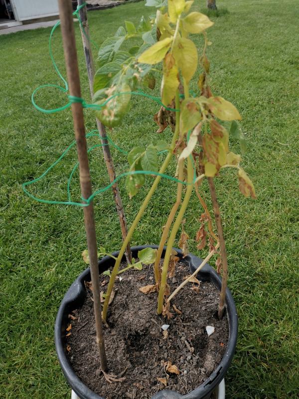 Hier ist noch ein weiterer Topf, in dem ich die Knollen 6 Wochen später gelegt habe. Ich vermute, daß dadurch, daß die Pflanze weniger lang im Haus stand der ganze Wuchs gedrungener geblieben ist. Auch die Blattfarbe sieht für mich gesünder aus. Einziger Makel sind die braun angetrockneten Blätter an einem Zweig. Kann der so bleiben, oder sollte dieser Zweig besser entfernt werden?