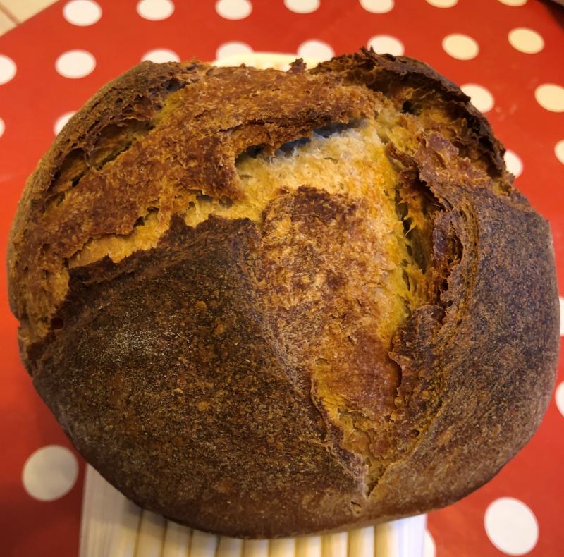 Gestern Abend habe ich den ersten "frei geschobenen" großen Laib auf einer Glasplatte gebacken, und abgesehen von leichten Rissen unten finde ich es sehr gelungen.