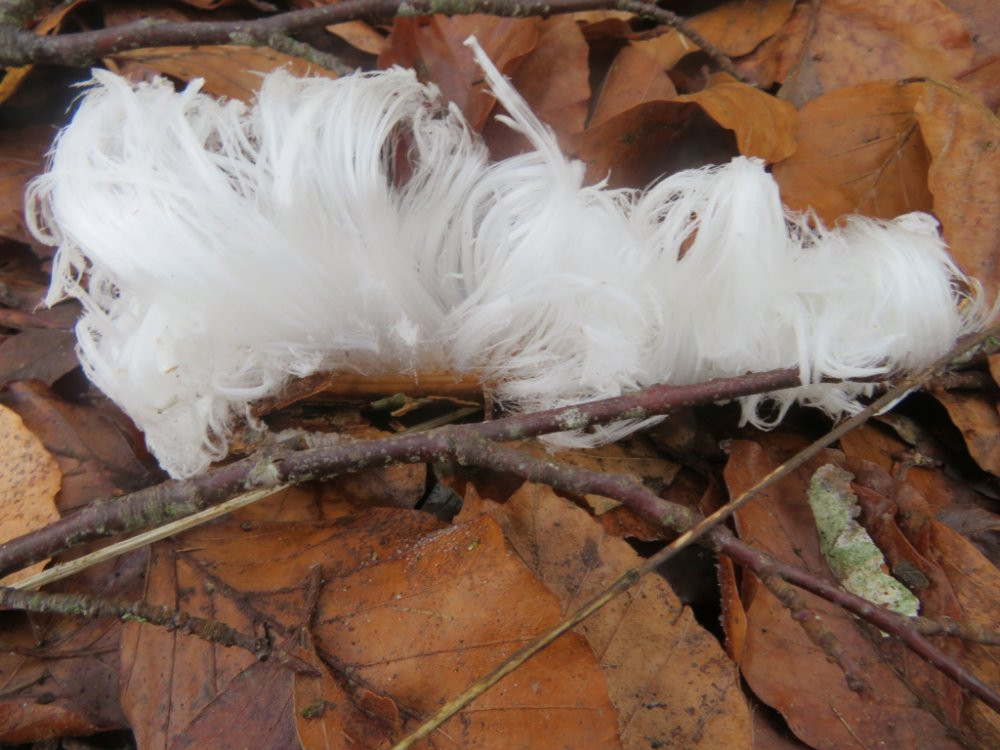 sich das haarige Eis, welches sich auf feuchtem Totholz bildet, zu sehen ist.