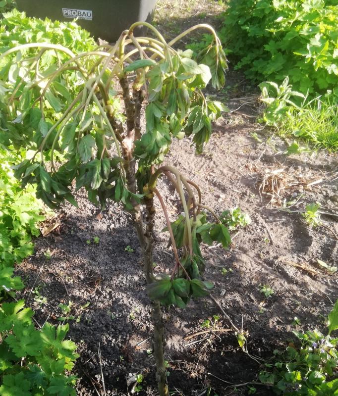 Ich hatte mich so gefreut darauf, dass nach vielen Jahren. eine aus Samen gezogene Strsuchpäonie endlich blühen würde (und die aufbrechende Knospe auch nicht durch Maifröste Schaden nehmen würde). Heute aber bot sich mir dieses Bild. :'(